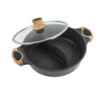 28cm granite pot with a glass lid, featuring a divided design to cook two different dishes simultaneously in one pot. Perfect for efficient and versatile cooking.